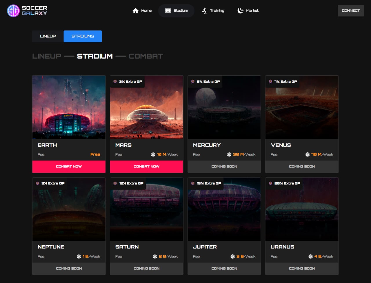 As soon as you have 5 players on your team, you can start to play the game and earn $SOG, also you can enter a higher level of the stadium on other planets with a $S2K registration fee to earn extra Galaxy Points.